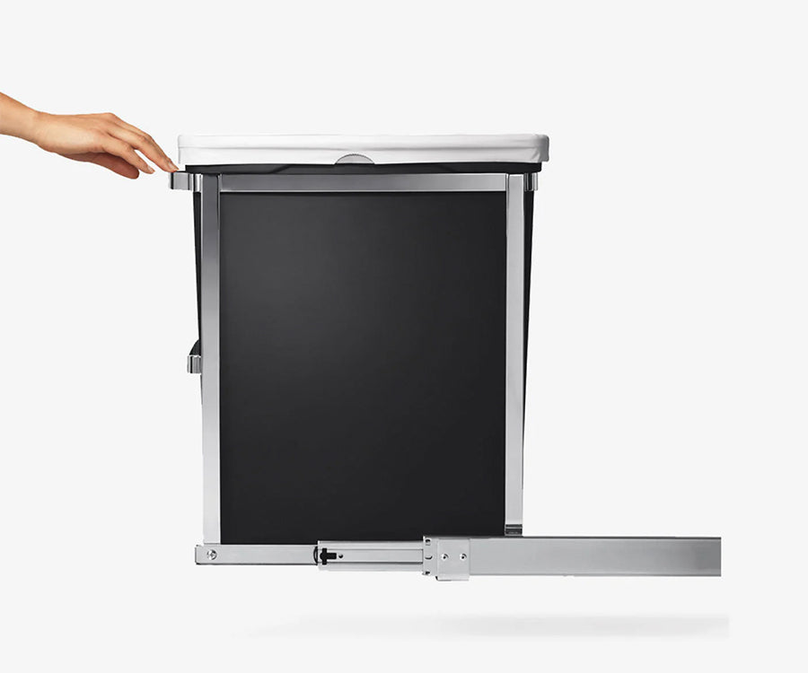 Greifen Sie den große Chromstahlgriff um den Abfalleimer aus dem Schrank schnell zu herausziehen.